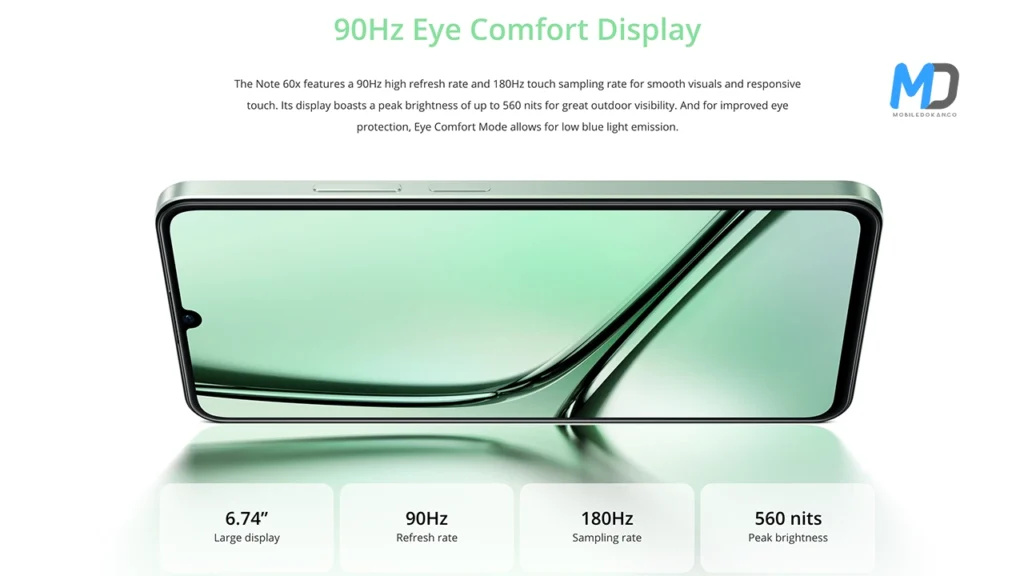 The Note 60x has a sleek profile, measuring just 7.84mm in depth and weighing 187g, making it comfortable to hold and carry. Its design includes a 3.5mm headphone jack, dual SIM support, and a dedicated microSD card slot for convenience.