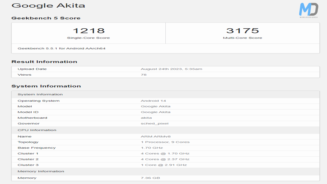 The new model(Google Pixel 8a) has been spotted on Geekbench 5 with the model name Google Akita. It scored 1218 on the single-core test and 3175 on the multi-core test. According to Geekbench, the model has been spotted with 8GB of RAM and Android 14. The CPU configuration revealed that there will be 9 cores along with a 2.91GHz large core, accompanied by four balanced cores clocked at 2.37GHz, and four power-efficient cores humming at 1.70GHz. The CPU details indicate that the processor will be a Tnsor G3 chipset.