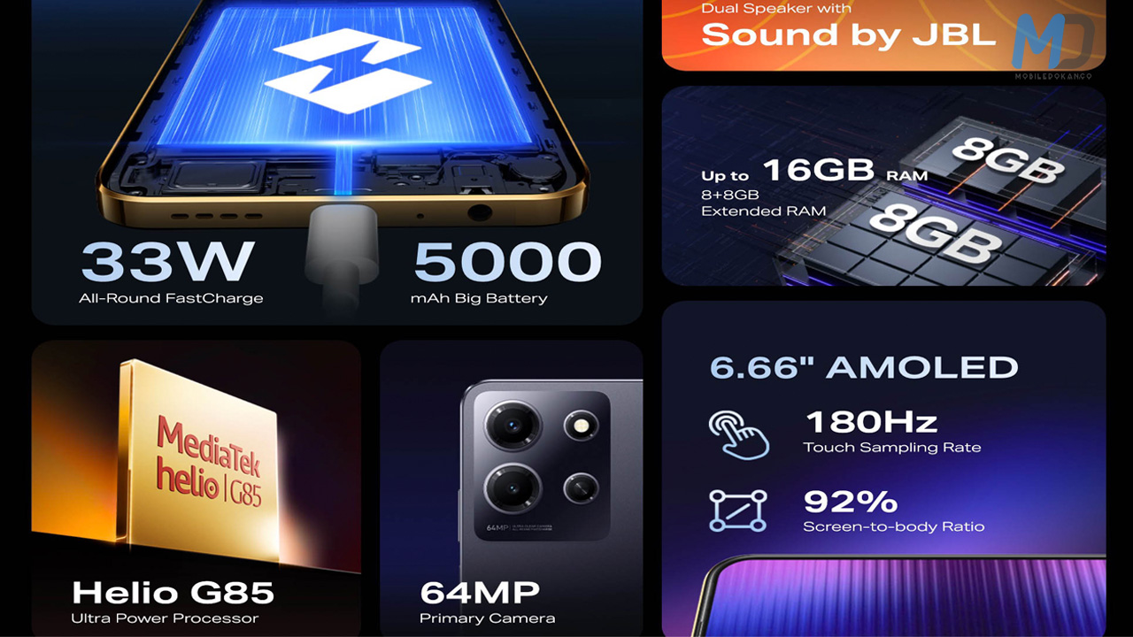 On the processor, you will get MediaTek’s Helio G85 chipset with 8GB RAM and up to 256GB storage. There is a triple camera setup on the back with a 64MP main camera. But the other two camera modules are unknown. It is powered by XOS 13 based on Android 13.The phone sports stereo speakers tuned by JBL.