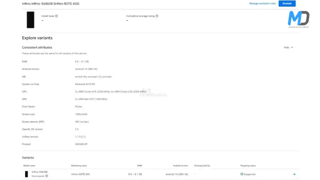 The Google Play Console listing mentions a MediaTek MT6789 system on a chip. This chip includes two Cortex-A76 cores and six A55 cores, with a Mali G57 GPU onboard. This indicates that the Infinix Note 40S will be powered by a Helio G99 processor. The device will come with 8GB RAM, with likely more options at launch. On the software side, it will ship with Android 14 OS out of the box.