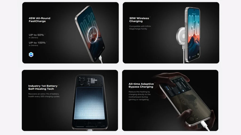 The Note 60 sports a 6500mAh battery with 45W wired fast charging support and 30W wireless charging, along with a bypass charging system as well. Infinix promises up to 6 years of battery life guarantee to its users.