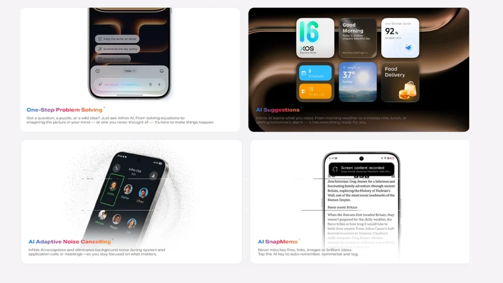 Powered by the latest XOS 16, the Infinix Note 60 delivers a smarter AI-driven experience. With Infinix AI, you can solve questions, generate ideas, and get instant assistance anytime. AI Adaptive Noise Cancelling ensures clear calls by filtering background noise, while AI Suggestions proactively prepare alarms, weather updates, and daily tasks.
