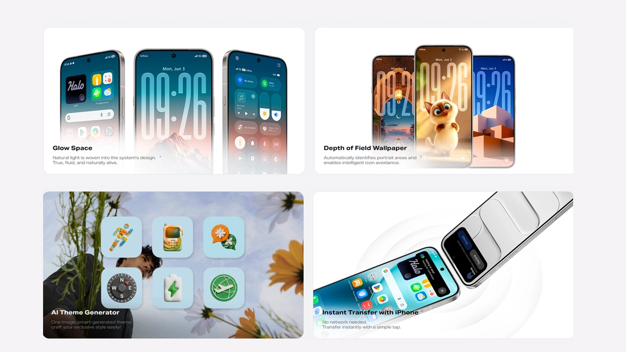 The handy AI SnapMemo lets you quickly capture and summarize important files, links, and notes with a single tap. Personalization is enhanced with Glow Space, an AI Theme Generator, and Depth of Field Wallpaper for a dynamic look. Plus, Halo Instant Transfer enables quick file sharing with iPhone — no network needed.