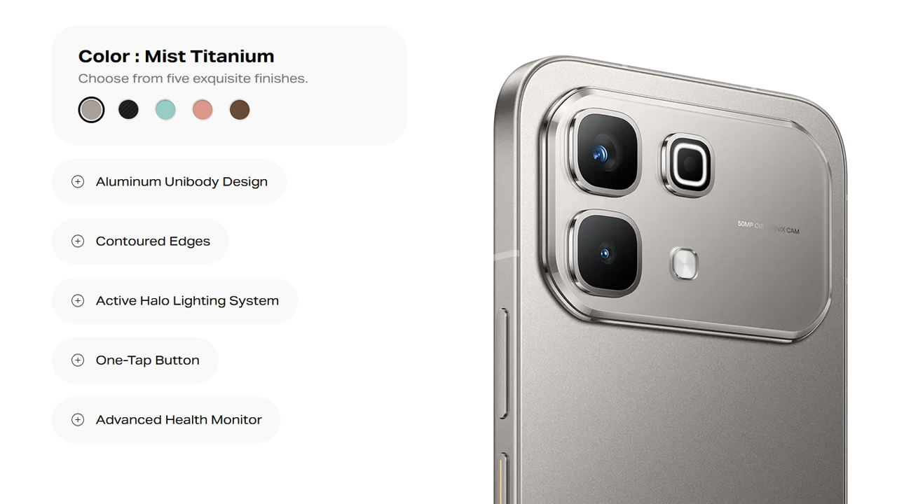 This device arrived with a premium metal design and active Halo lighting on the back. In dimensions, the Note 60 measures 162.37 x 77.17 x 7.45mm and weighs 199g. It is available in 5 colors: Mist Titanium, Midnight Black, Fizz Blue, Rose Gold, and Mocha Brown.