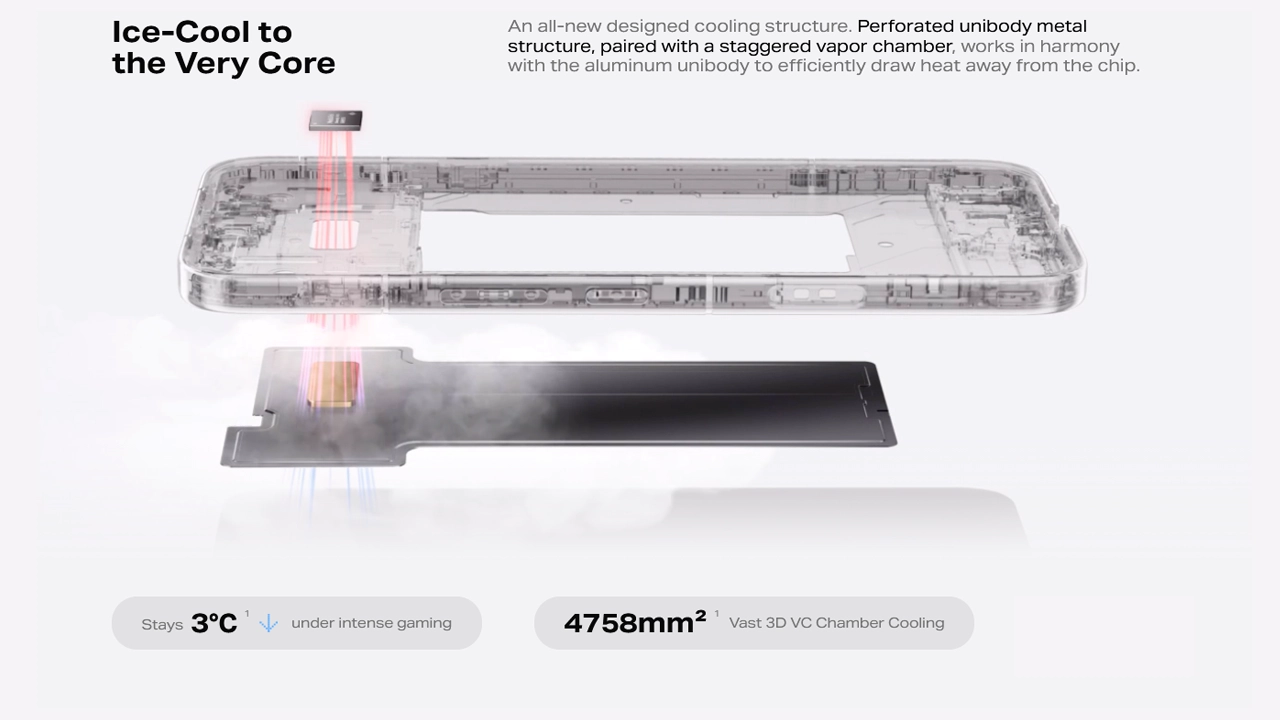 For sustained performance, the phone features a 4758mm² 3D VC cooling chamber, paired with a perforated-metal unibody and a vapor-chamberr design. This advanced cooling system keeps the device up to 3°C cooler during intense gaming, reducing heat and maintaining peak performance.