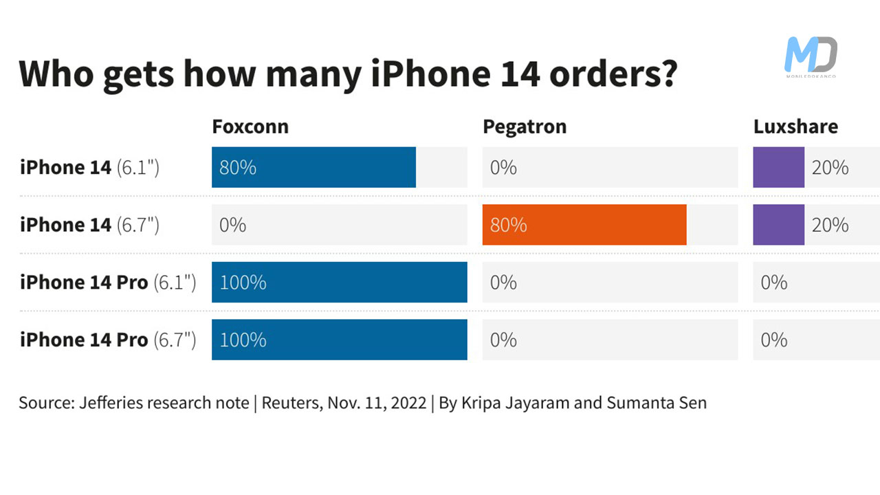 Next year, the manufacture of the iPhone 15 will supposedly begin in sync with that in China. That means there’s already some variety in the vanilla series. The pie chart above shows that three separate businesses are involved in production.