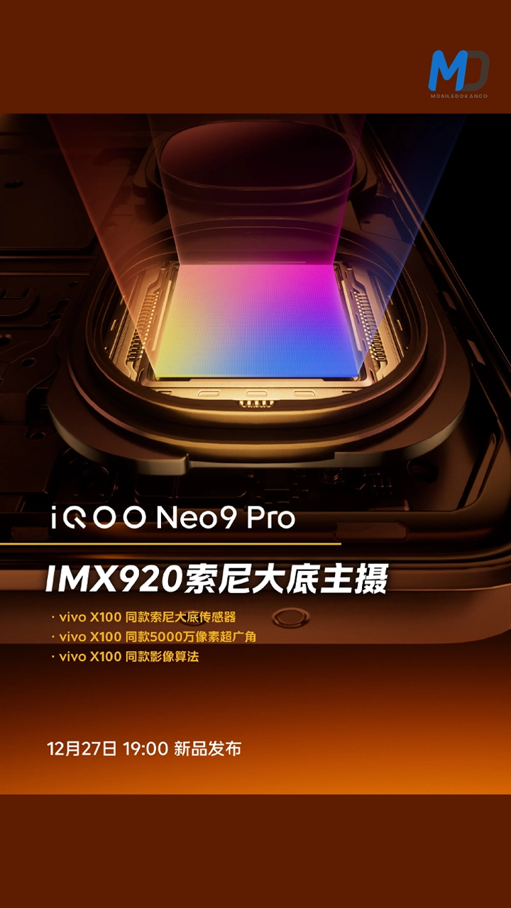 iQOO is set to launch its iQOO Neo9 series smartphones in China on Dec. 27. Leading up to the release, the brand has been revealing key details about the Neo9 and Neo9 Pro. In the latest update, iQOO shared a poster with specs for the primary and ultra-wide cameras on the iQOO Neo9 Pro model.
