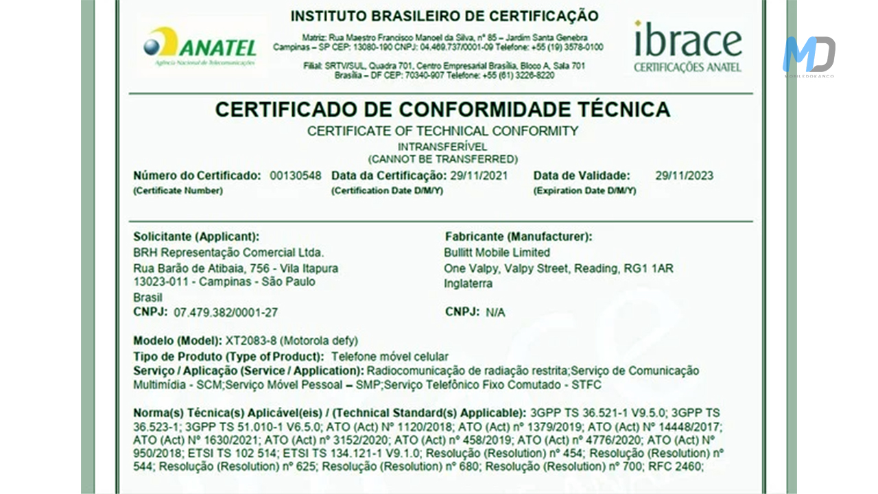 However, despite the launch, it is absent from Brazil. The Motorola Defy has been approved by the National Telecommunications Agency in Brazil, suggesting a possible launch sooner. The certificate shows a device with the model number XT2083-8.