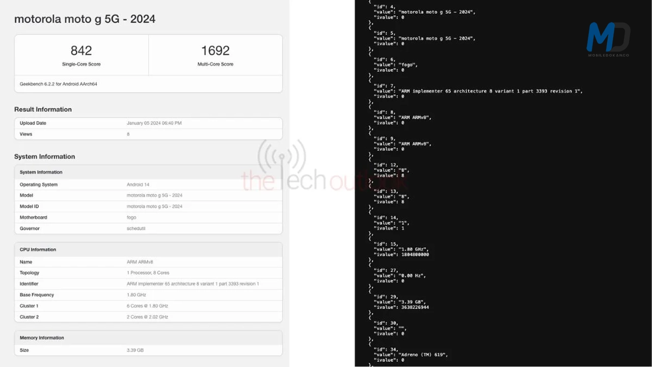 The Moto G 5G (2024) model number is not available in the Geekbench database. However, details show a motherboard codenamed ‘fogo’ with a Snapdragon 4 Gen 1 processor, including two 2.02GHz primary cores and six 1.80GHz additional cores, along with an Adreno 619 GPU. It comes with 4GB RAM and runs on Android 14 OS. In Geekbench tests, it scores 842 in single-core and 1,692 in multi-core.