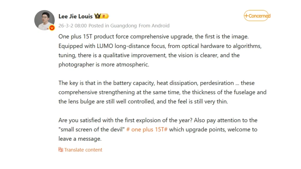 According to the OnePlus China President’s Weibo post, the OnePlus 15T will feature an upgraded LUMA periscope lens. The phone will also include a larger battery and improved cooling. While maintaining a slim, lightweight design with minimal lens protrusion.
