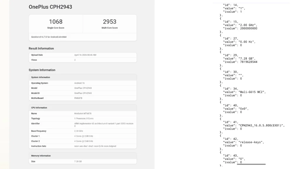 OnePlus Nord CE6 Lite appeared on the Geekbench benchmark with the model number CPH2943. The Geekbench listing confirmed that it is going to be powered by the MediaTek Dimensity 7400 chip and will run on Android 16. This model has 8GB RAM.