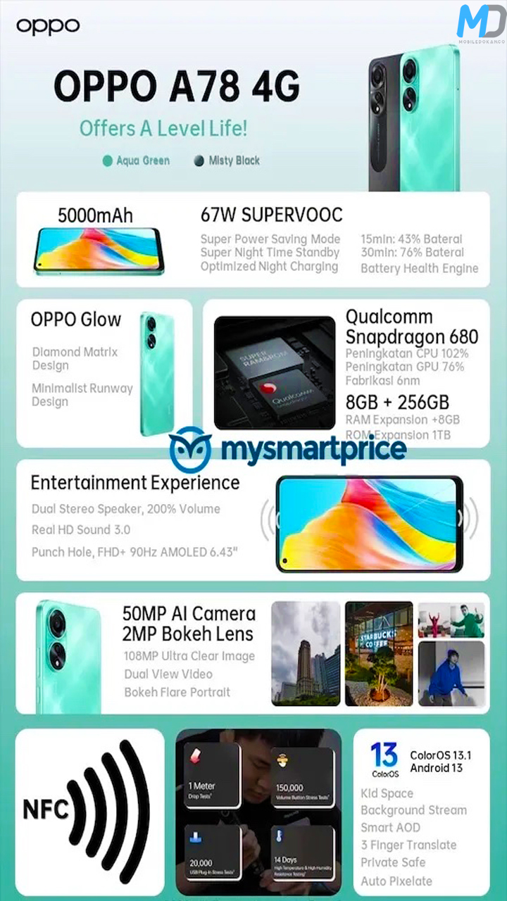 Oppo launched Oppo A78 5G in January 2023. We all know that Oppo is going to launch a 4G variant of OPPO A78. A week ago, we reported that Oppo A78 bags have IMDA certification. Now, here we have known about its marketing materials and some of its key specs.