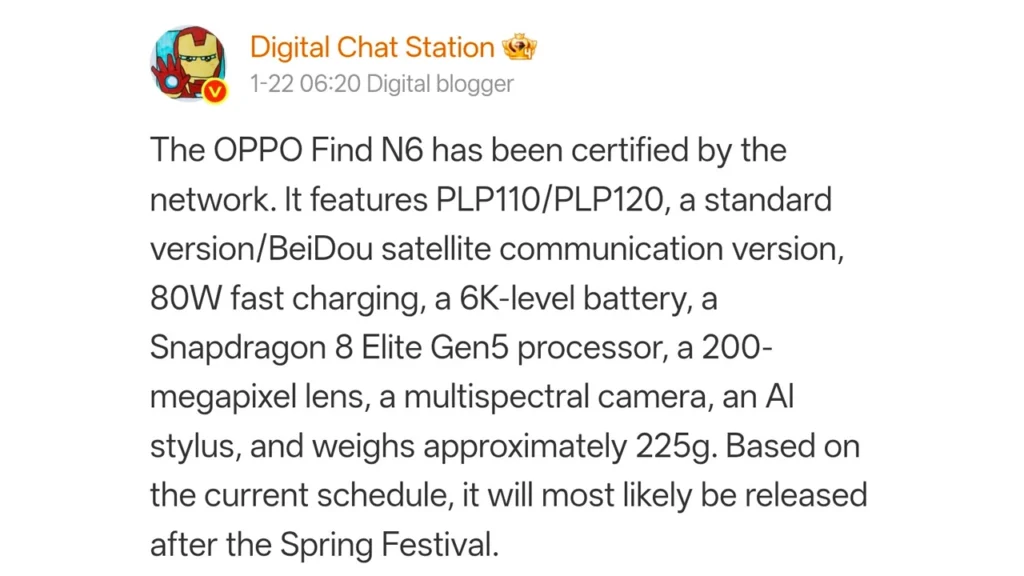 Oppo’s upcoming flodable flagship, the Find N6, appears to be edging steadily toward its official debut. The growing buzz is well-founded, as the device has already cleared network certification. Well-known Chinese tipster Digital Chat Station, along with another trusted source, has shared several of the phone’s major specifications.