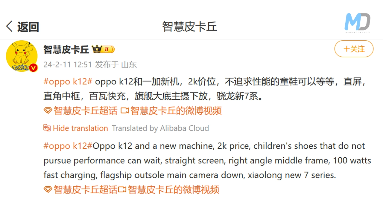 According to a Weibo post of Smart Pikachu, the Oppo K12 will have a flat screen and a flat frame, similar to the Oppo K11.