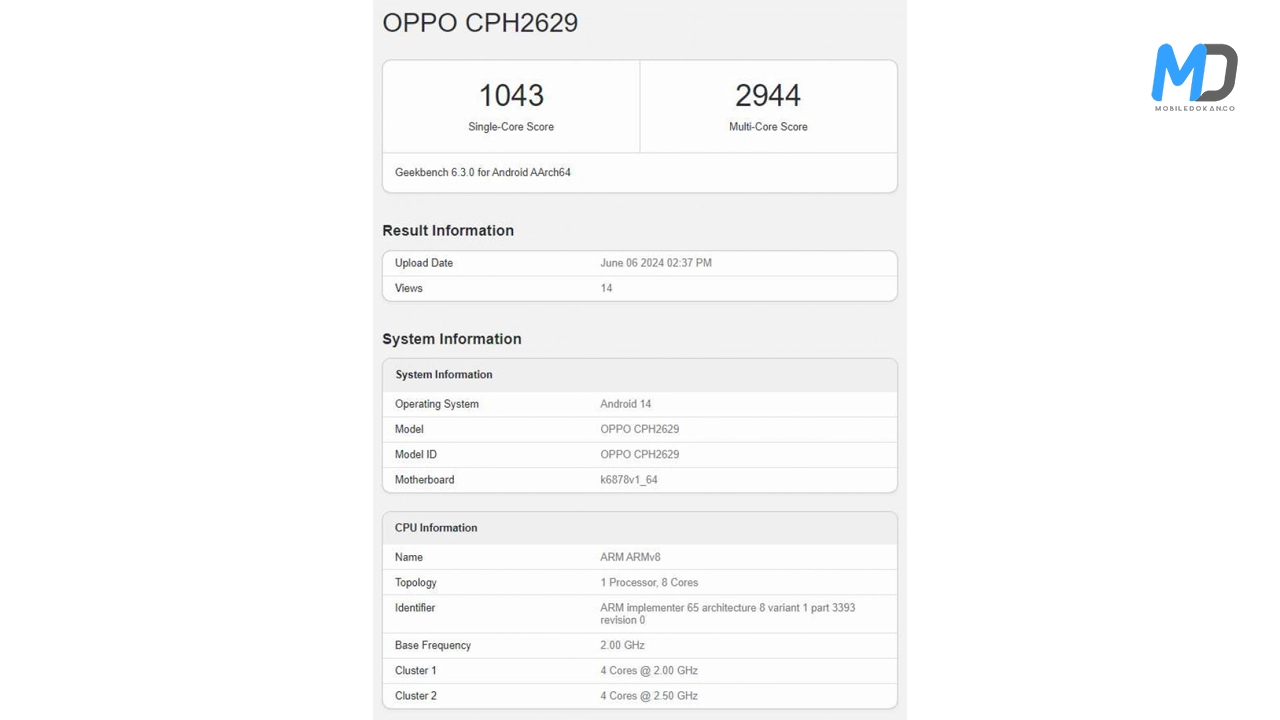 The specs reveal four cores at 2.5GHz and four more at 2.0GHz. The GPU is the Mali-G615. The phone includes 12GB of RAM and runs on Android 14.