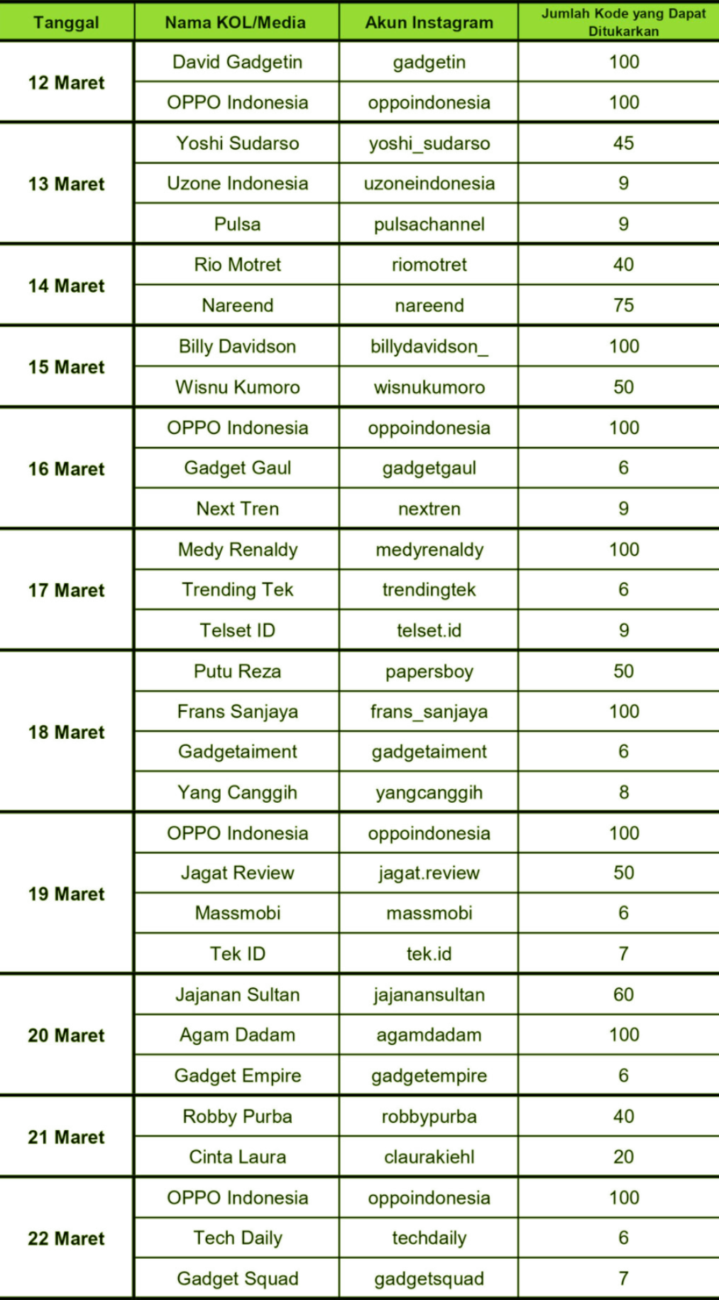 If you want to buy the Oppo Reno5 Marvel Edition, then you will definitely need a unique code. To acquire such a code, you will have to follow specific Instagram accounts (including @OppoIndonesia), each of which will hand out a limited number of codes on specific days. You can check the table below for the calendar (better hurry, today 200 codes will give below.