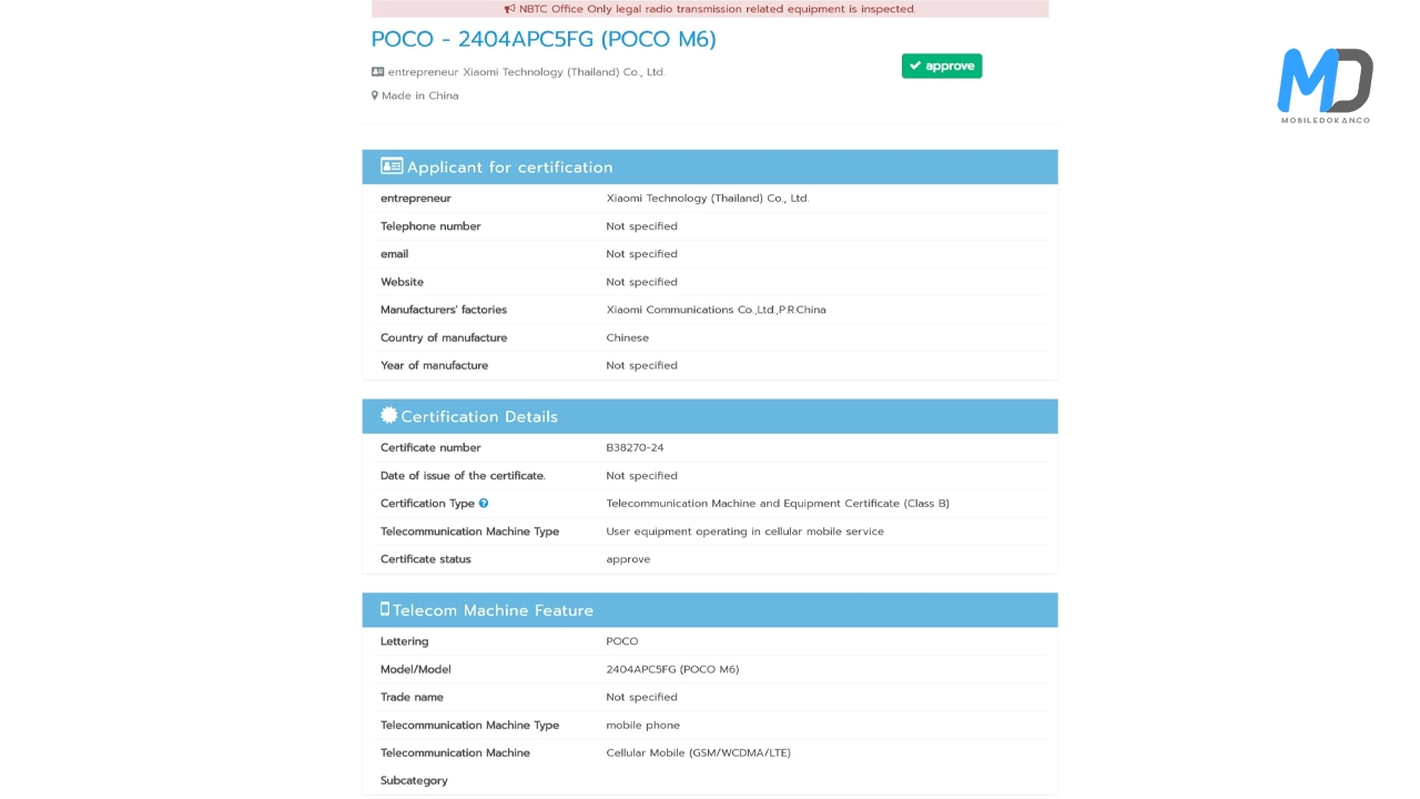 The Poco M6 4G bears the model code 2404APC5FG. The NBTC listing doesn’t reveal specs. However, the FCC disclosed that the smartphone will operate on HyperOS. It will also feature a battery with a capacity of 4,930 mAh, potentially marketed as 5,000 mAh.