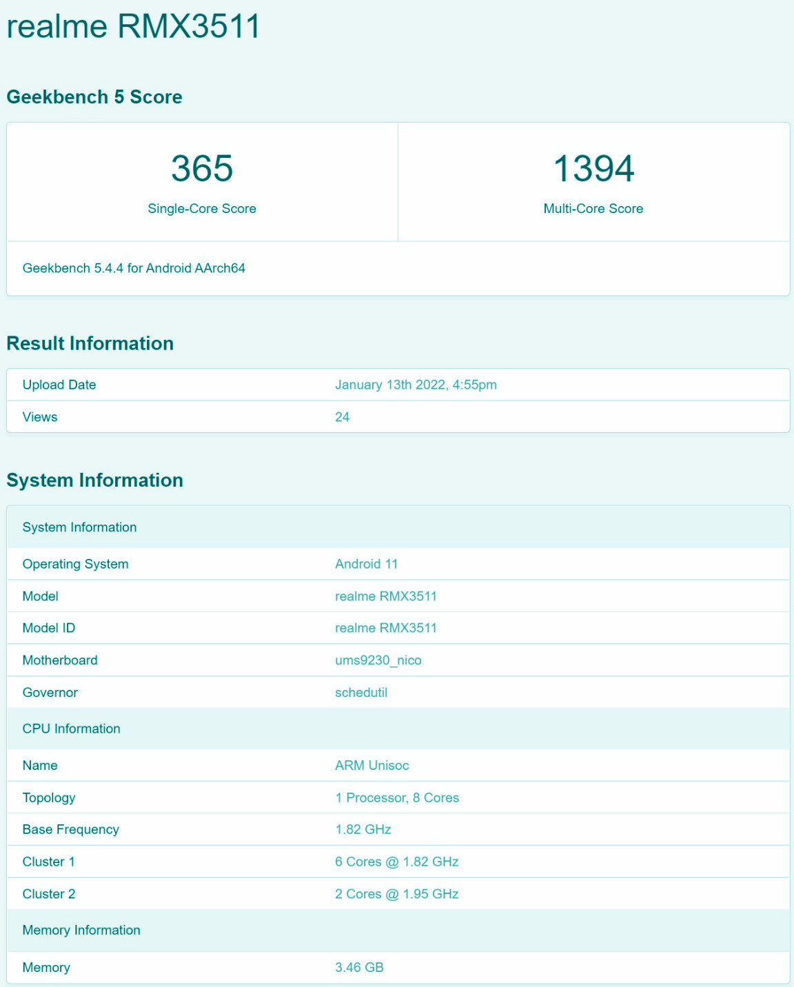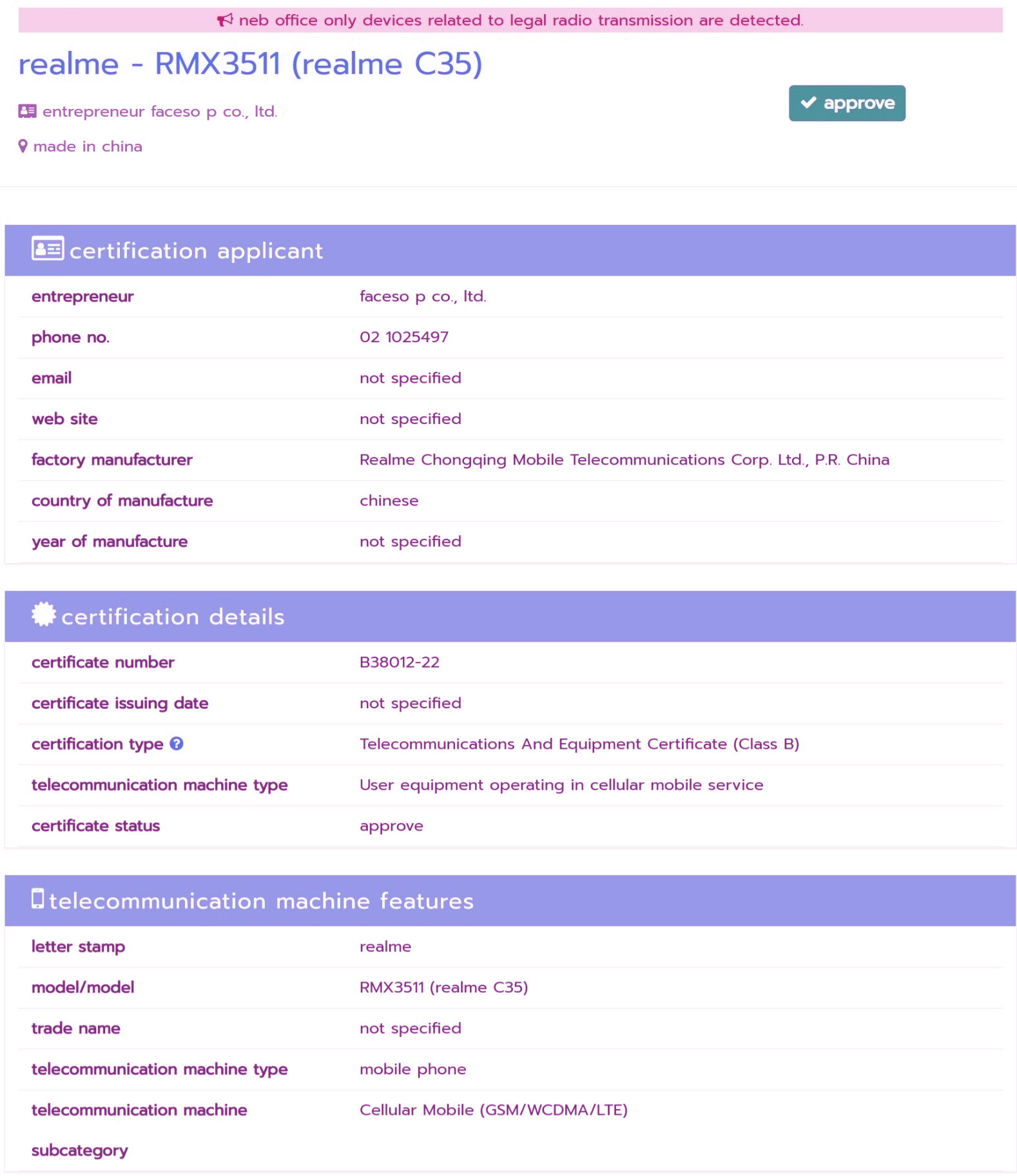 Realme C35 got the NBTC certification finally. The Realme RMX3511 spotted on Geekbench this week was certified through the Thailand’s NBTC using an Realme C35 moniker, suggesting that it will launch soon. The Thai certification authority doesn’t disclose any details about the Realme C35, but thanks to Geekbench we have confirmation that the phone will run Android 11, an octa-core Unisoc processor, and 4GB of RAM.