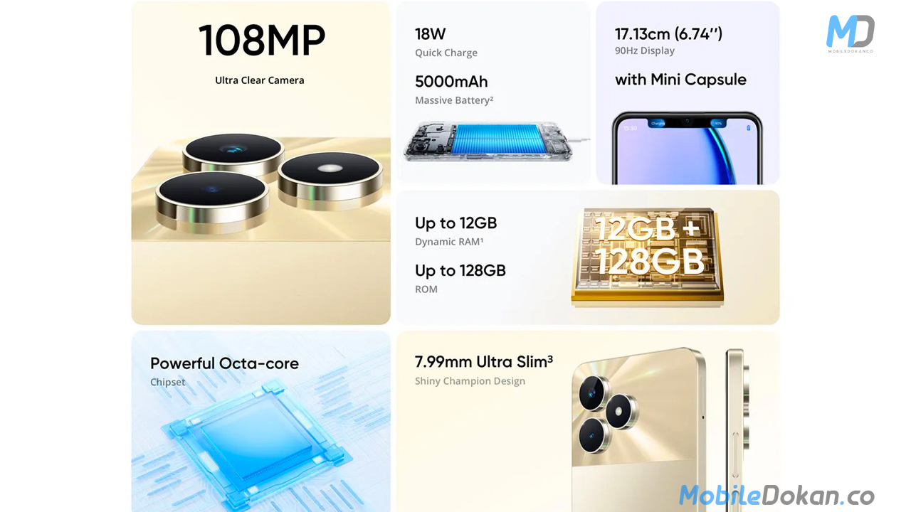 The Realme C53 comes with a 6.74” IPS LCD with a 90Hz refresh rate and FHD+ resolution. It is 7.99mm thick. Basically, It measures 167.2×76.7×7.99mm and weighs about 186 grams. It is powered by a Unisoc T612 chipset and paired up with 4GB/6GB RAM and 64GB/128GB storage. you can add up to 6GB of virtual RAM and a microSD (up to 2TB). The C53 runs on Android 13-based Realme UI T Edition.
