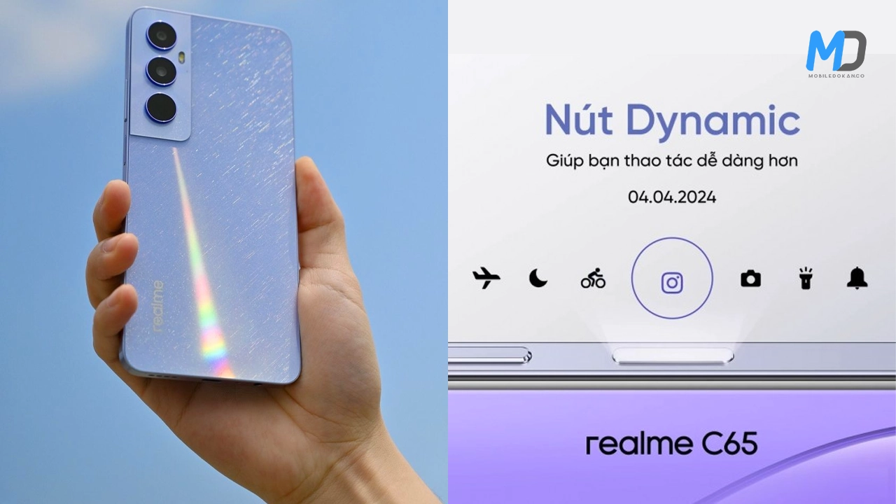 The Realme C65 features a centered punch-hole display and includes the Dynamic Button feature introduced with the Realme 12 5G.
