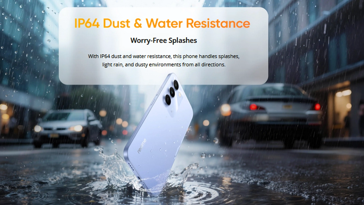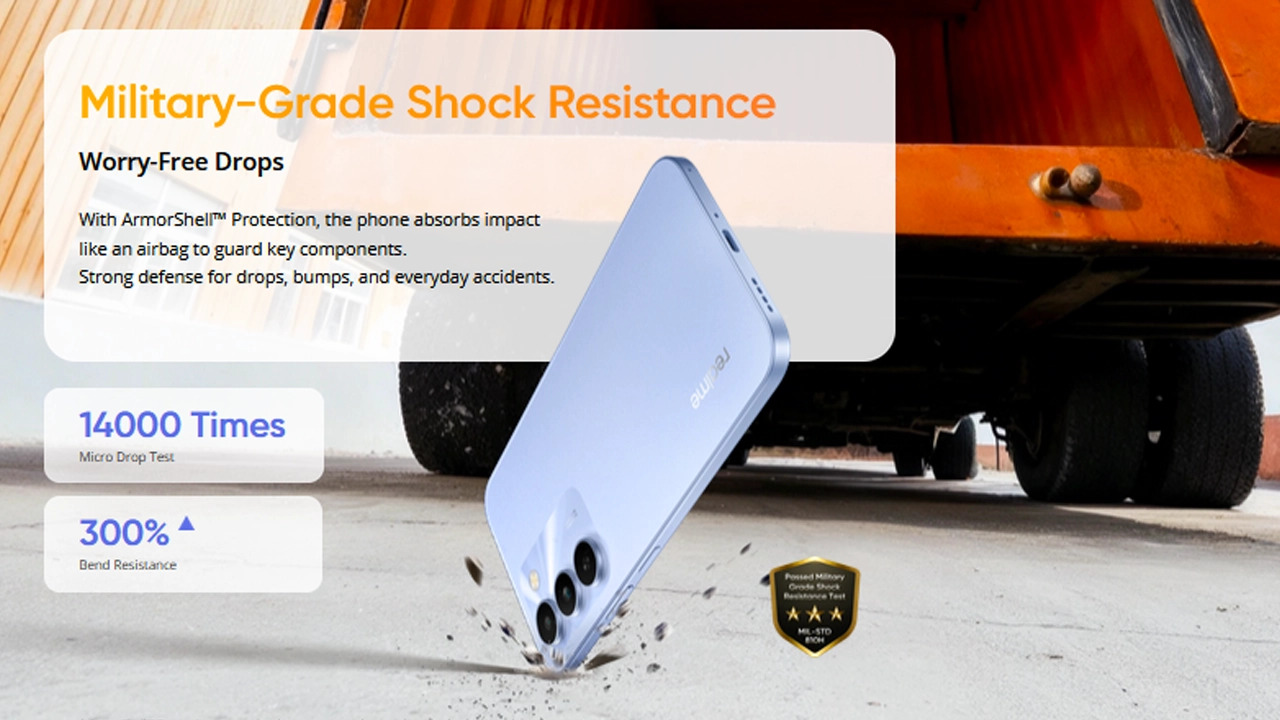 The Realme C83 5G focuses on durability, featuring MIL-STD-810H certification, Military-Grade Shock Resistance, and ArmorShell Protection that absorbs impact like an airbag to protect internal components. The phone has reportedly passed 14,000 micro-drop tests and offers 300% higher bend resistance, helping it survive everyday drops and bumps.