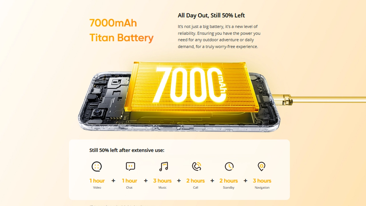 Realme claims the phone can still retain around 50% battery after extended usage, making it reliable for long outdoor days, streaming, calls, and navigation. The battery is also built for durability, operating in extreme temperatures from -20°C to 53°C, while smart anti-aging technology helps maintain battery health for up to 6 years. In addition, AI Power Saving optimizes energy consumption to extend usage time when the battery runs low.