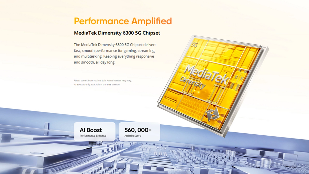 The Realme C83 delivers smooth and efficient performance with the MediaTek Dimensity 6300, a capable 5G processor designed for gaming, streaming, and multitasking. The chipset scores over 560,000 on AnTuTu, ensuring fast app launches and responsive daily usage. It also supports up to 6GB RAM with 12GB Dynamic RAM expansion, giving users up to 18GB dynamic memory for smoother multitasking and keeping up to 10 apps active in the background. The Realme C83 runs on Realme UI 7.0 based on Android 16.