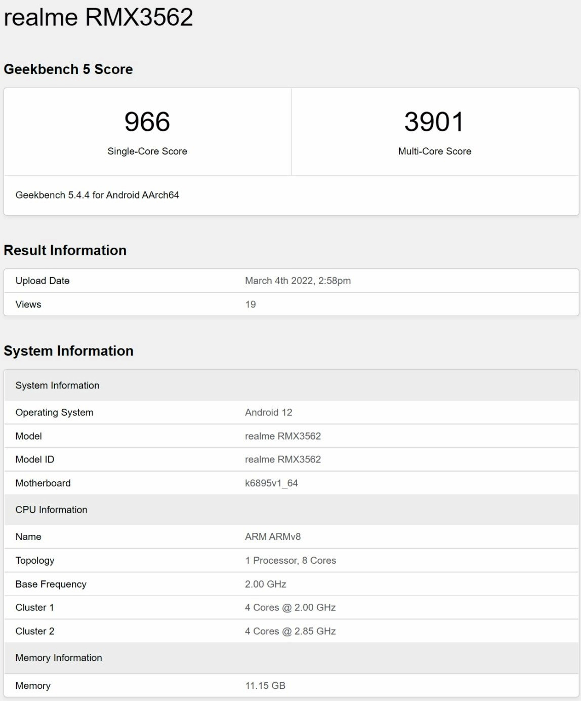 Geekbench has tested the latter. The RMX3562 runs Android 12 (likely with Realme UI 3.0 as the top layer) and has 12GB of RAM. Octa-core CPU power it with four cores running at speeds up to 2GHz, and four cores clocked to 2.85GHz.