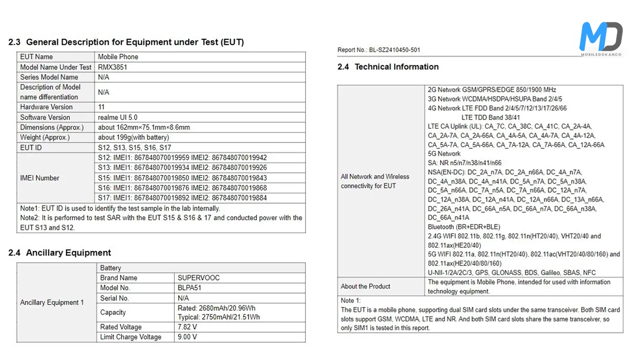According to the FCC, this device will sport a 5,500 mAh battery. The database shows that the smartphone will have a dual-cell battery. Its rated capacity is 2,680mAh, with a typical value of 2,750mAh. Certainly! The device has 5G support, dual-band Wi-Fi, Bluetooth, GPS, GLONASS, BDS, Galileo, SBAS, and NFC. The phone will come with Android 14 and Realme UI 5.0 pre-installed. Its dimensions are 162 x 75 x 8.6 mm, and it weighs 199g. The battery will utilize SuperVOOC technology for fast charging, but the exact speed remains uncertain.