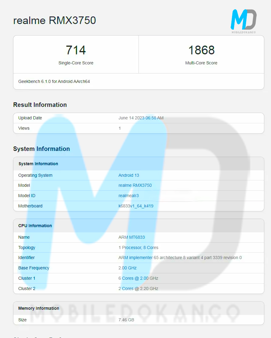 This device appeared on Geekbench with the model number realme RMX3750. It scored 714 on the single-core test and scored 1868 points on multi-score test. This listing reveals a motherboard codenamed k6833v1_64_k419 and the CPU name as ARM MT6833. It comprises six cores clocked at 2GHz and two cores clocked at 2.20GHz. This corresponds to the Dimensity 6020 processor. It has also shown 8GB of RAM in this listing. It will run with Android 13.