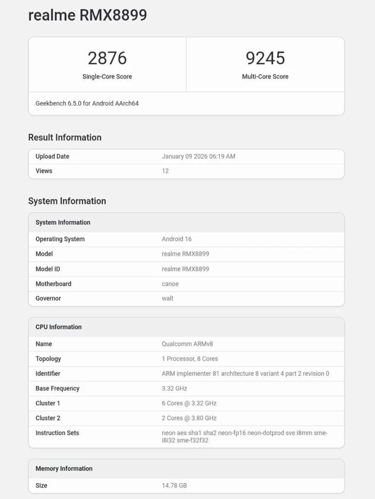 The Realme Neo 8, listed under the model number RMX8899, has posted impressive benchmark results: