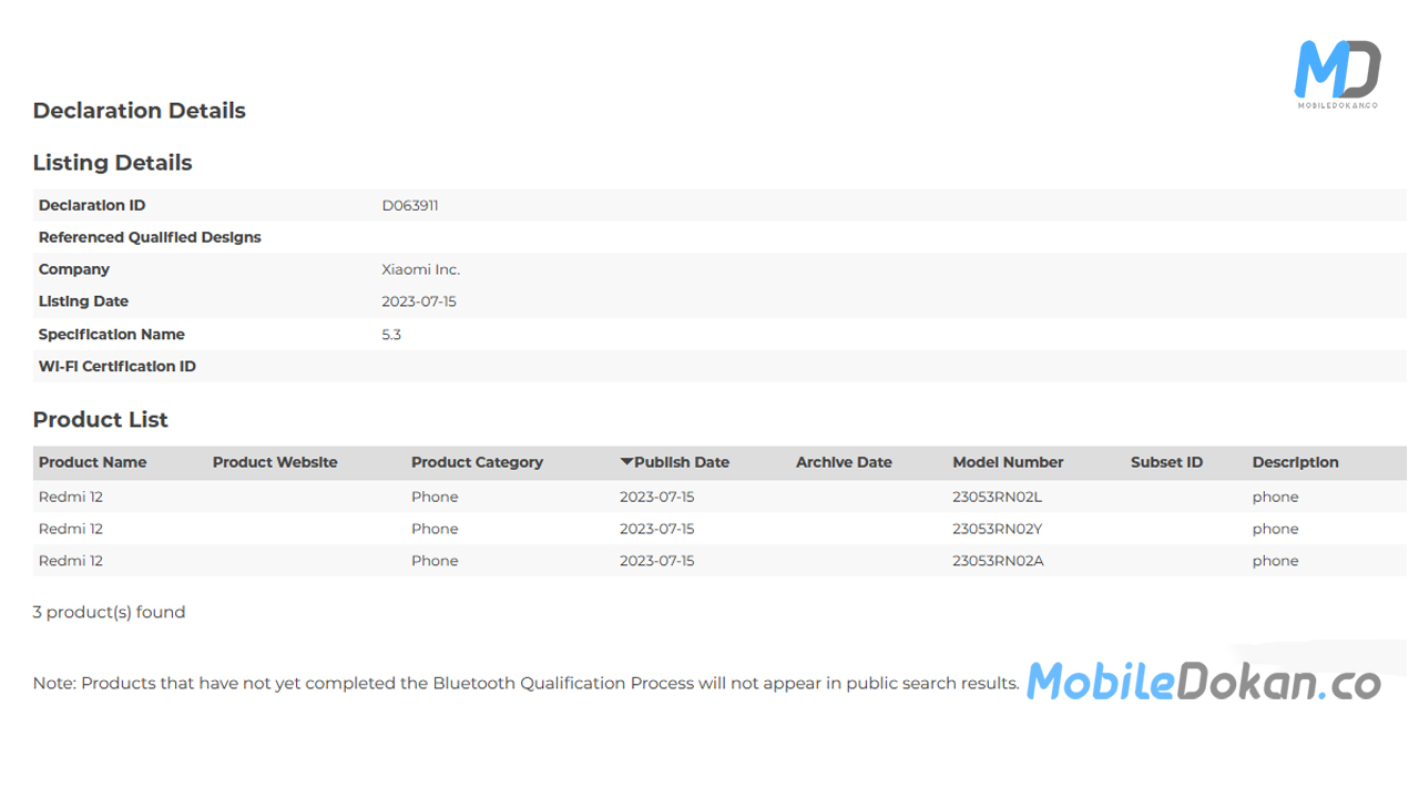 Redmi 12 was spotted on SIG certification with Declaration ID D063911. This certification listing confirmed that it will sport Bluetooth 5.3.