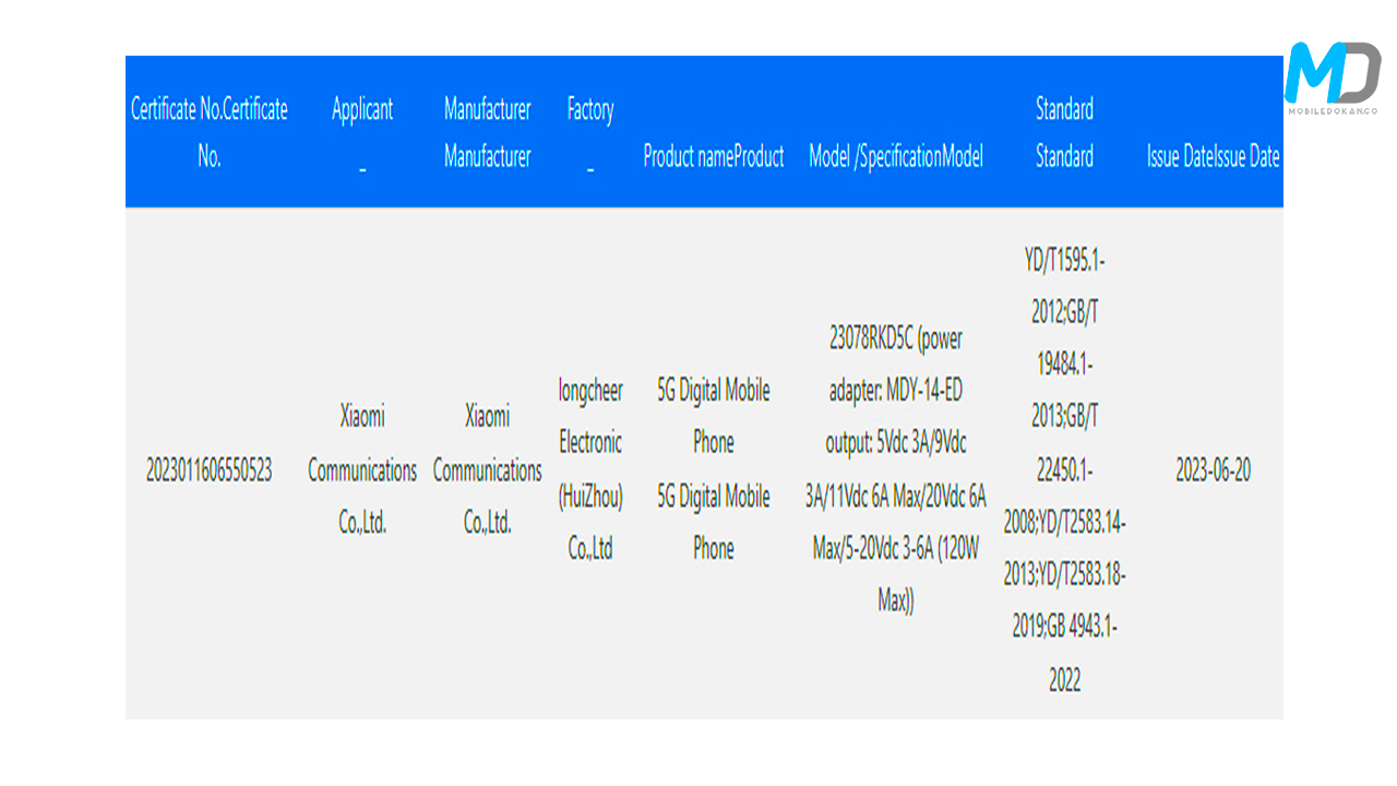 It has a model number called 23078RKD5C. The phone was found in a list on the 3C database. It has a special charger called Xiaomi MDY-14-ED, which can charge the phone very fast, up to 120W. The same charger was used for the Redmi K60 Pro.