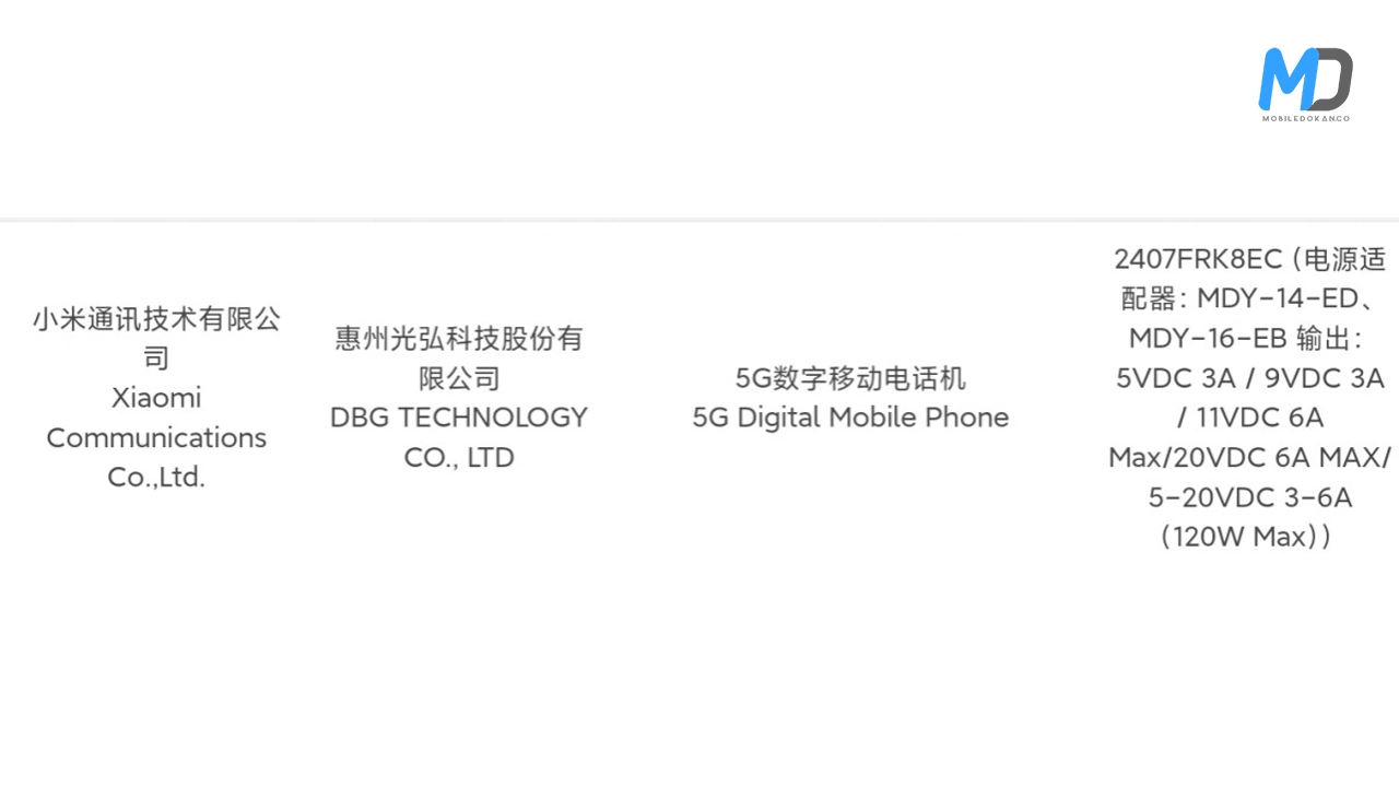 The new smartphone model, 2407FRK8EC, is expected to launch in July 2024. It will work with the 120W MDY-14-ED wired charger and the 80W MDY-16-EB wireless charger.