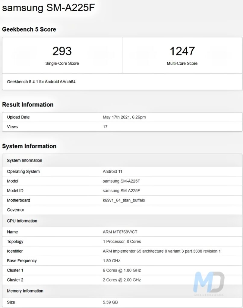 The benchmark database tells us that the galaxy a22 4g, wearing version designation sm-a225f, runs android eleven and has 6gb ram on board, at the same time as the cpu segment reveals the phone has the mt6769v/ct processor below the hood, which we recognize is a part of the helio g80 soc.