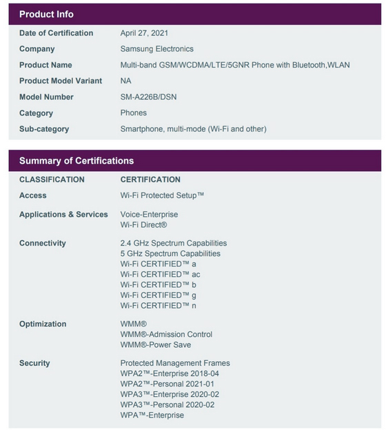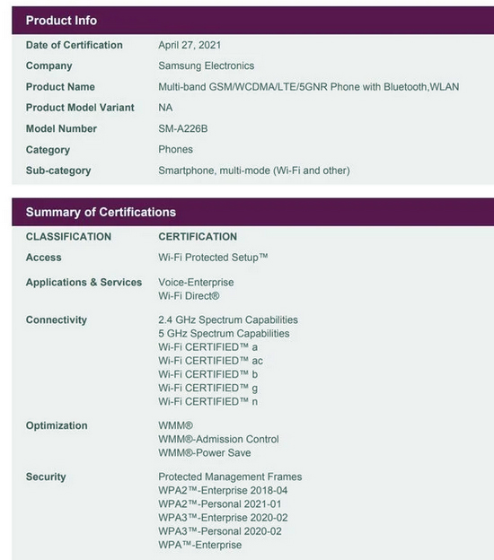 Samsung Galaxy A22 5G get the Wi-Fi Alliance certification
