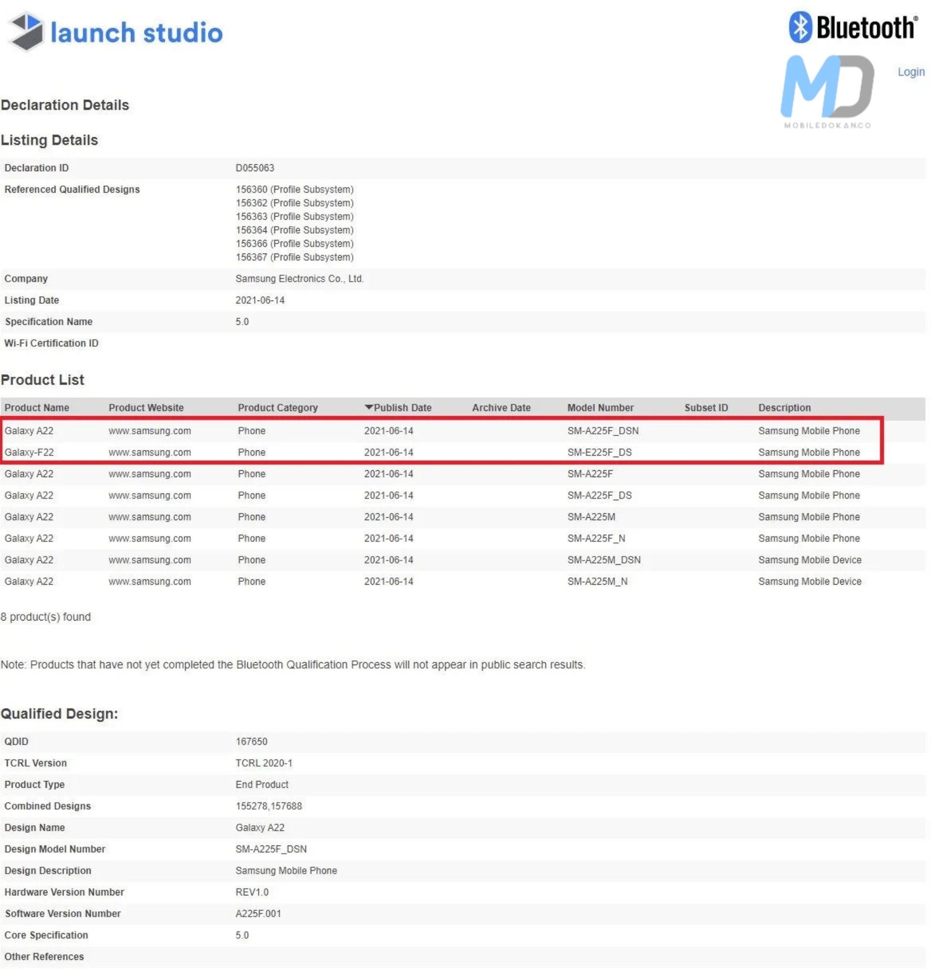 - Samsung Galaxy F22 has spotted on the Bluetooth SIG platform.