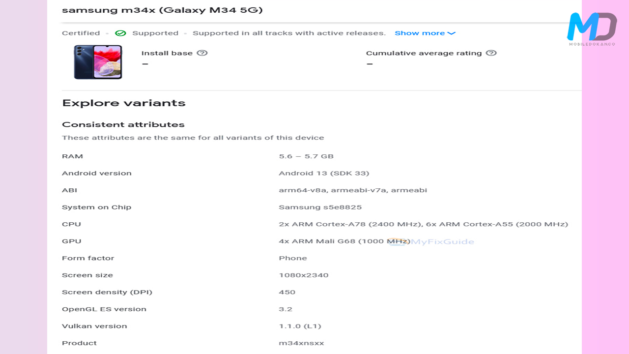 Samsung Galaxy M34 5G appeared on Google Play Console with the model Number samsung m34x. Here you can see in this listing that it confirms the screen size to be 1,080 x 2,340px. It appeared with a 6GB RAM model. The chipset codenamed S5E8825 which recognizes the Exynos 1280 SoC. The listing says it will run on Android 13.