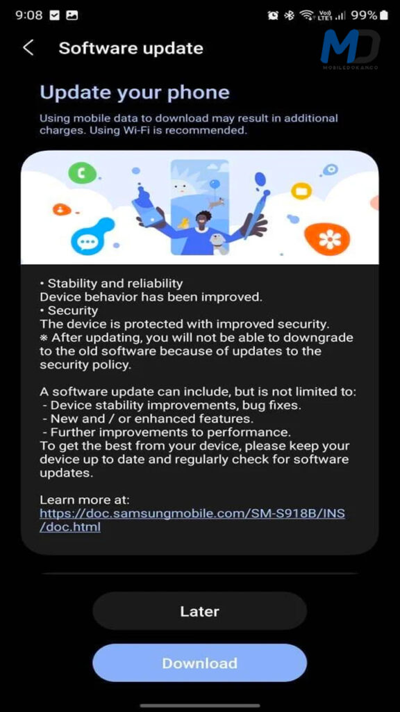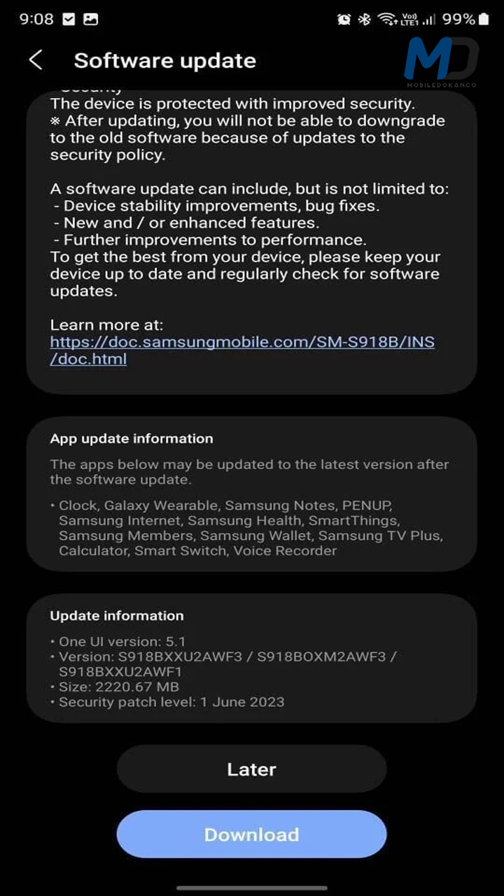 Samsung has started sending a big camera update to its Galaxy S23 phones in India. The update comes with firmware version “S91xBXXU2AWF3“. It requires about 2.2GB of download. It also includes the June 2023 security patch also.