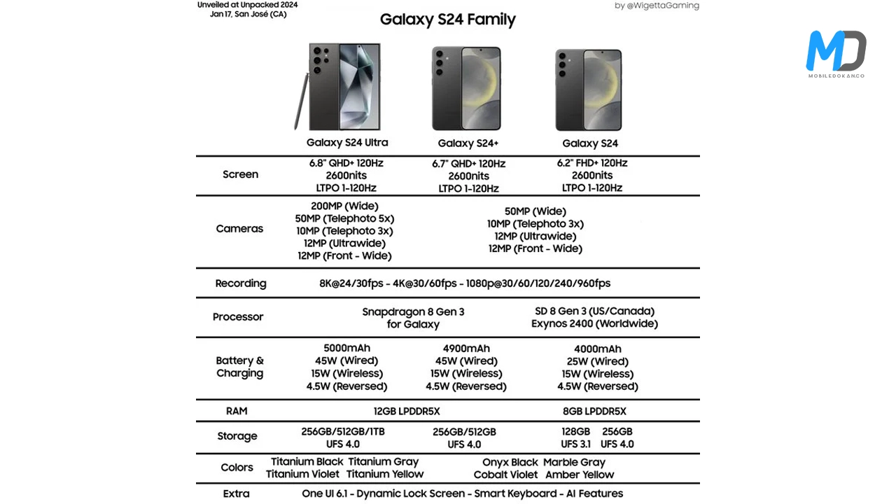WigettaGaming posted the Galaxy S24 lineup infographic from the South Korean tech giant on X (formerly Twitter). The Exynos 2400 will power the global models of the Galaxy series. However, in the US and Canada, the Galaxy S24, Galaxy S24+, and Galaxy S24 Ultra will feature the Qualcomm Snapdragon 8 Gen 3 SoC.
