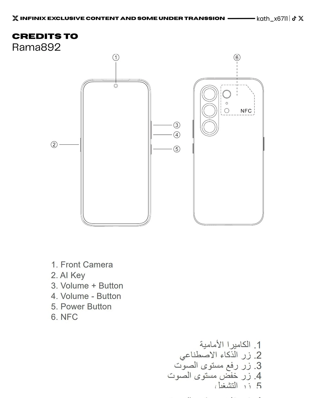 The leaked user manual diagrams reveal a familiar modern smartphone layout. On the front, the Tecno Camon 50 Pro features a centred punch-hole selfie camera, slim bezels, and a flat display panel. Meanwhile, the sides show a dedicated AI key, volume up and down buttons, and a power button.