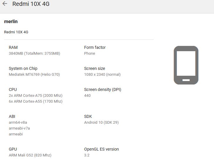 Unfortunately, the re-emerged version of the Redmi 10X is not available on Google Play Console. It does specifically list a MediaTek Helio G70 chipset for the Redmi 10X. A downgrade compared to the new, beefed-up Helio G85, inside the Redmi Note 9. We also see the screen resolution of the Redmi 10X matches-up perfectly with the one on the Redmi Note 9, at 1080 x 2340 pixels.