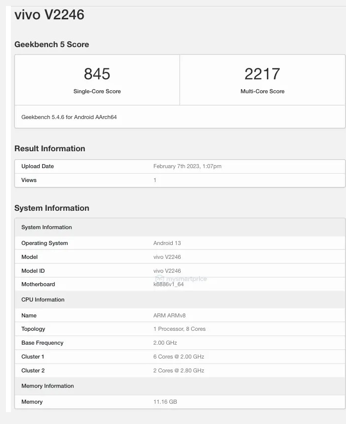 Smartphone V2246 from Geekbench is powered by Android 13. It’s rare for a mid-range device to have 12GB of RAM. Its Mali-G610MC4 graphics processing unit (GPU) points to an unmentioned MediaTek chipset.