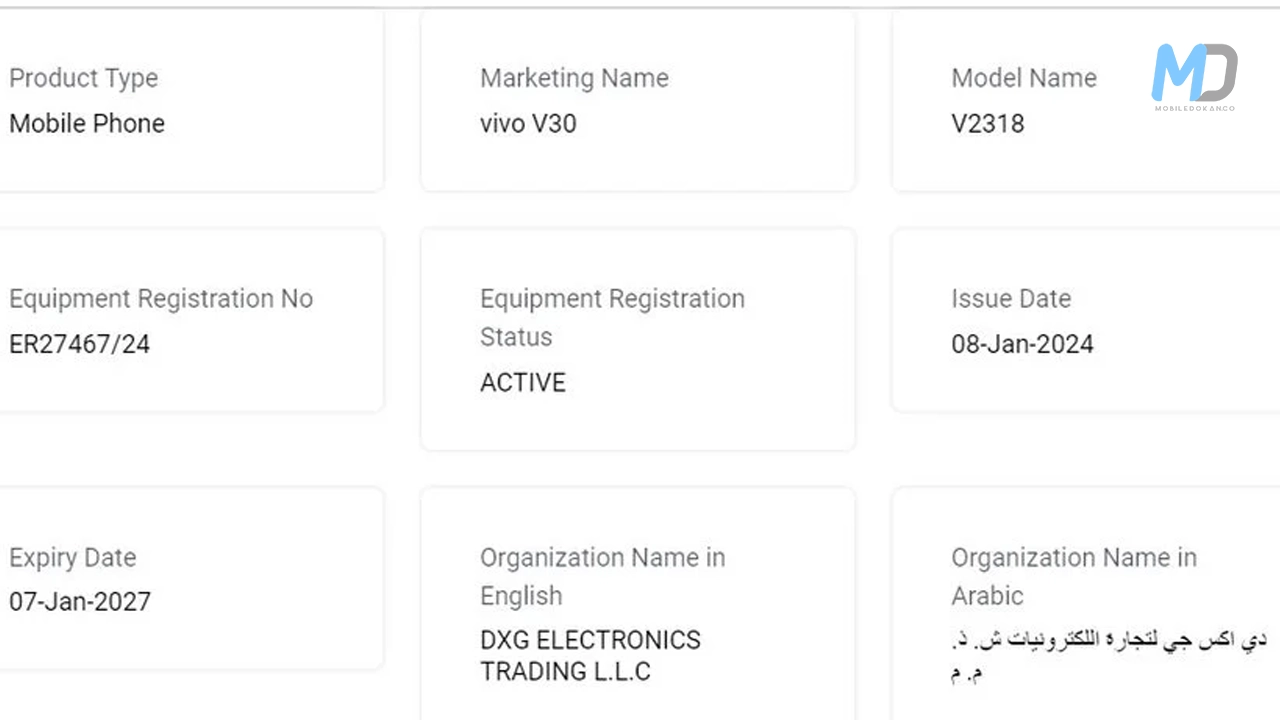 The Vivo V30, certified by TDRA and carrying the model number V2318, is set to debut in the UAE. It has also received certifications from various platforms like Indonesia’s SDPPI, Bluetooth SIG, Taiwan’s NCC, and Geekbench. With multiple certifications, it seems likely that the Vivo V30 will launch in the first quarter of this year.