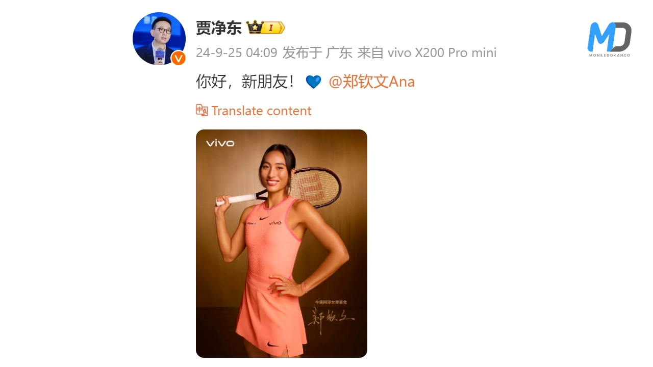 The name of the mini version appeared on Weibo. It was shared by Jia Jingdong, a Vivo brand manager when he introduced a new ambassador. He welcomed Zheng Qingwen, an Olympic tennis player who won gold in Paris 2024. This made her the first Asian woman to achieve the honor. Jia Jingdong used the Vivo X200 Pro Mini for the post.