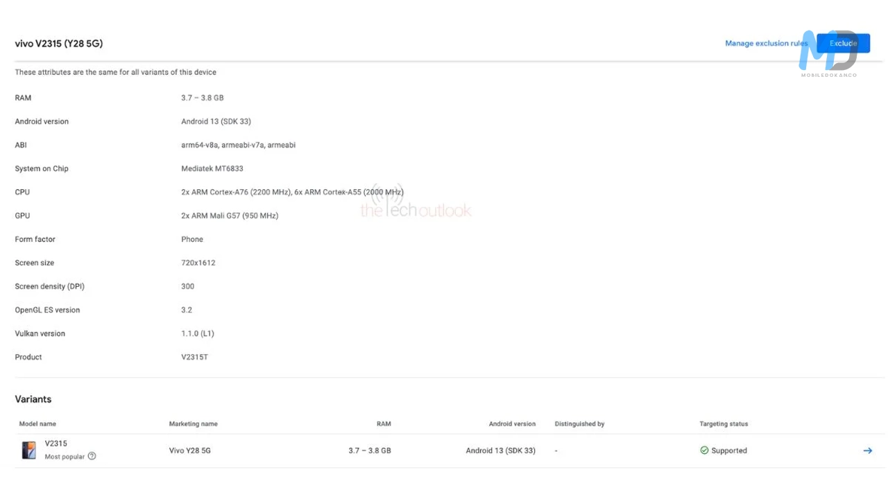 The Vivo Y28 5G, identified by model number V2315 in the Google Play Console certification. It also features a waterdrop notch and a substantial bottom chin based on a rendered image. The back panel showcases a dual-tone design with two camera rings. The phone is powered by a MediaTek MT6833 processor. It consists of two Cortex-A76 cores at 2.2GHz and six Cortex-A55 cores at 2GHz, along with a Mali G57 GPU. It comes with 4GB RAM, a display resolution of 720 x 1,612 pixels, and a screen density of 300 DPI. The Vivo Y28 5G runs on Android 13 OS right out of the box.