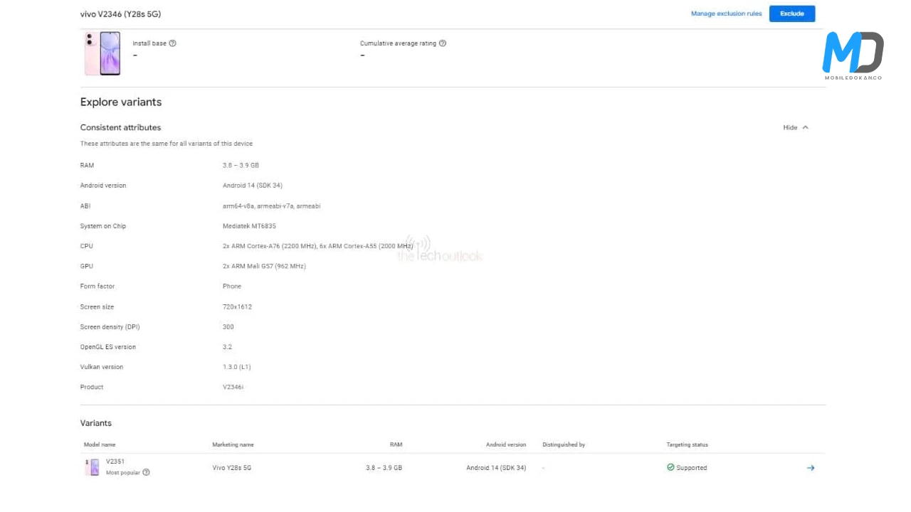 The Vivo Y28s 5G is listed with a MediaTek MT6835 system on a chip. It includes two A76 cores clocked at 2.2GHz and six A55 cores at 2GHz, alongside a Mali G57 GPU. This setup indicates the phone will use a MediaTek Dimensity 6100+ processor. The upcoming device will have 4GB RAM, with possibly more options at launch. It will run on Android 14 OS.
