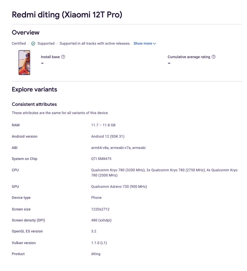The listing verifies the device’s name as well as a few other important specifications, such as 12GB RAM, Android 12, and the previously reported Snapdragon 8+ Gen 1 CPU. The display resolution of 1220×2712 pixels is specified, which is the same as the just-announced Redmi K50 Ultra.