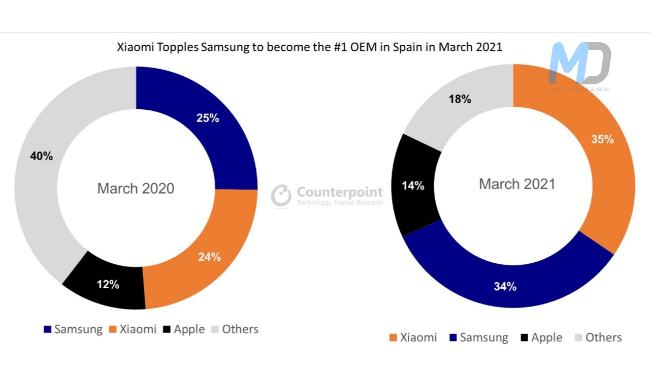 The market share of Xiaomi in Spain in March 2020 was 24 percent and now it stands at 35 percent in March 2021, registering impressive growth. Even Samsung registered growth from 25 percent in March 2020 to 34 percent in March this year.